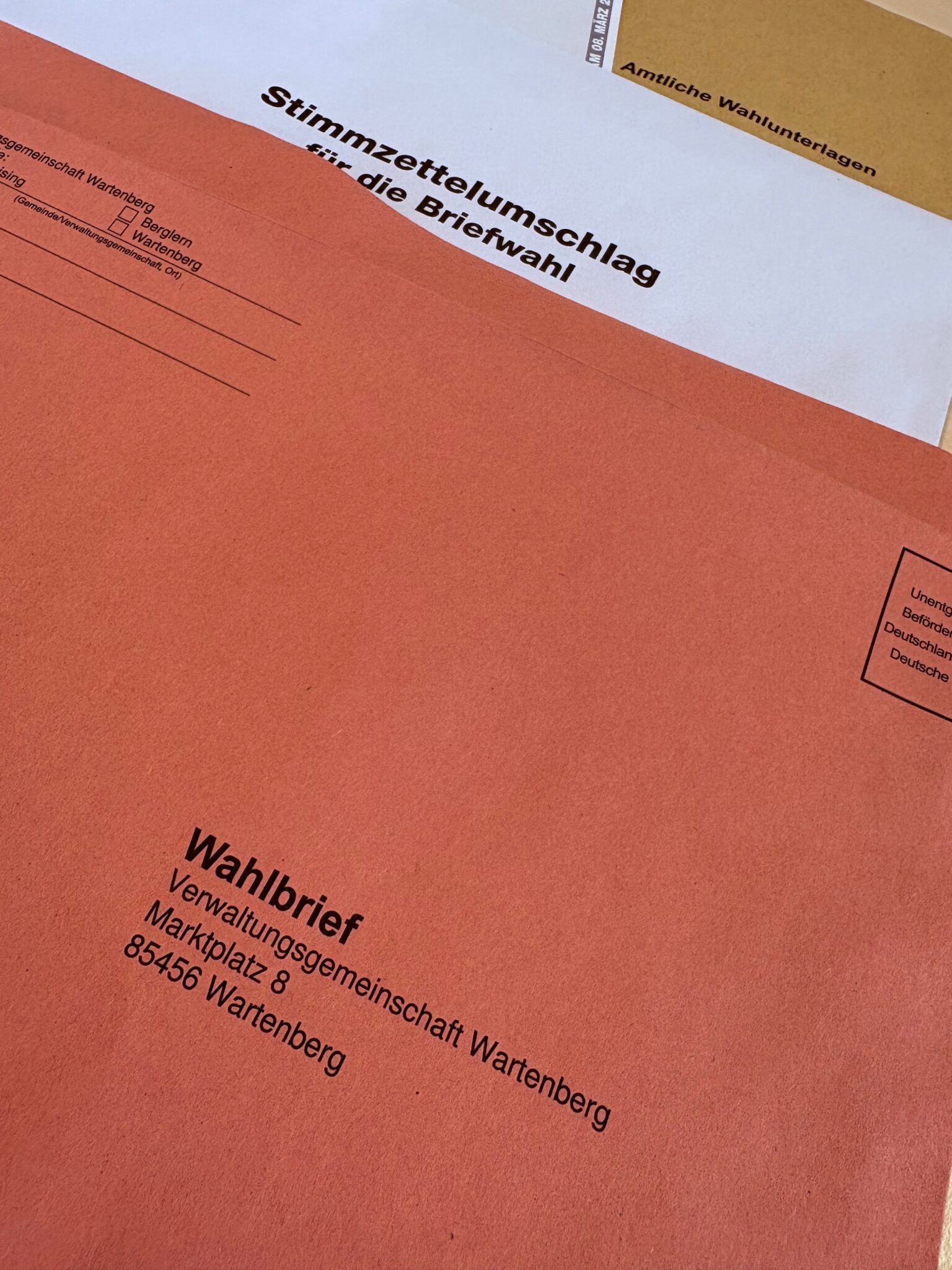 Nach Ihrer Wahl können Sie die Wahlbriefe entweder bei der Post oder in den Hausbriefkasten der Verwaltungsgemeinschaft Wartenberg, Marktplatz 8, 85456 Wartenberg einwerfen. Bei Versendung mit der Post berücksichtigen Sie bitte die Postlaufzeiten (4 Werktage) für eine rechtzeitige Zustellung bis zum Wahltag. Wahlbriefe sollten daher spätestens am Mittwoch, den 04.03.2026 bei der Deutschen Post eingeliefert werden, damit eine Zustellung bis zum Wahltag sichergestellt werden kann. Alle bis Sonntag, 08.03.2026, 18:00 Uhr, bei der Verwaltungsgemeinschaft Wartenberg eingehenden Wahlbriefe werden bei der Wahl berücksichtigt.