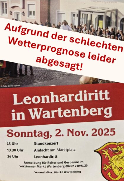 Aufgrund der schlechten Wetterprognose muss der für morgen geplante Leonhardiritt leider abgesagt werden.